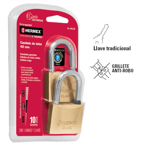 CANDADOS DE LATÓN, 40MM, GANCHO LARGO, 2 PIEZAS